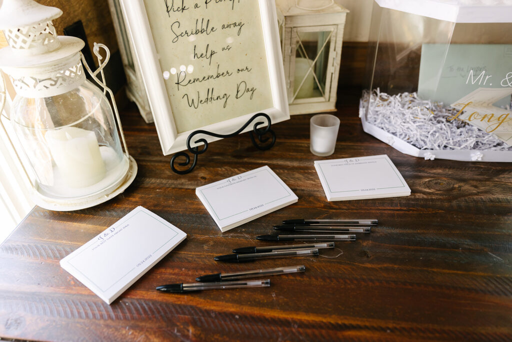 For something simple and sweet, set out small cards and ask guests to write advice, well wishes, or future date night ideas. You can read them on your honeymoon or save them for your first anniversary. It’s a low-stress option that still feels personal.
