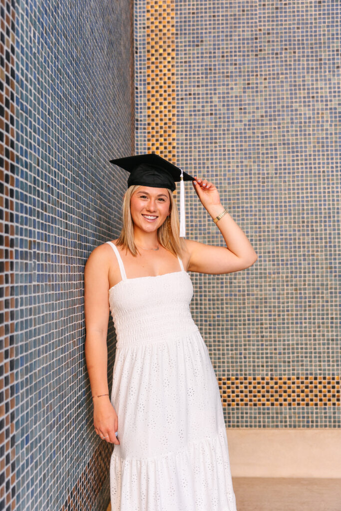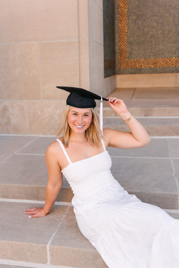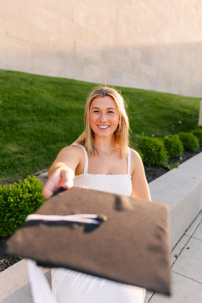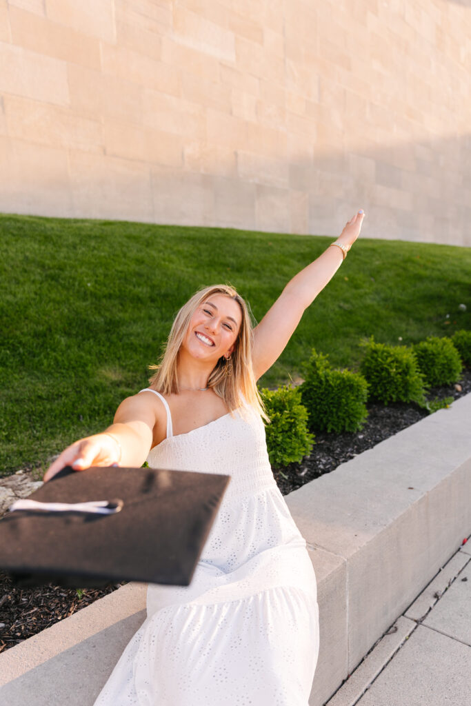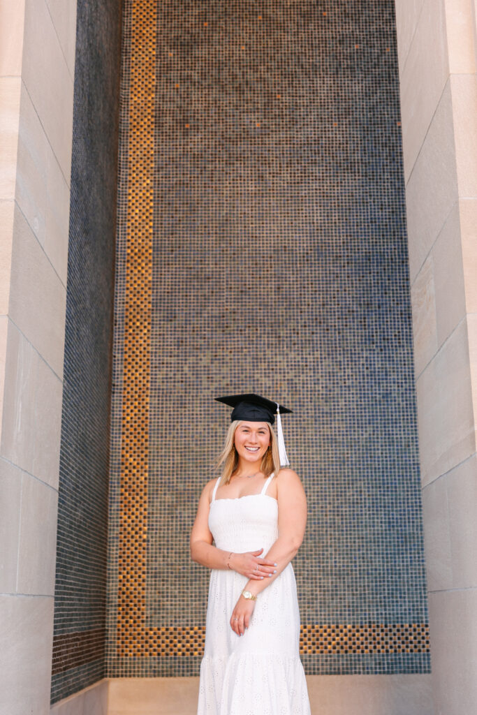 We started near the tiled walls of the memorial, where the colors and textures gave a modern, editorial feel. Then we moved toward the open plaza for those classic cap-and-gown photos every grad needs. Brooke twirled, tossed her cap, and soaked up every second of her achievement.