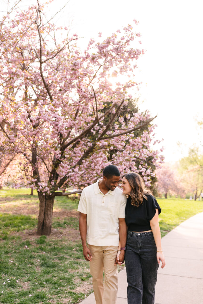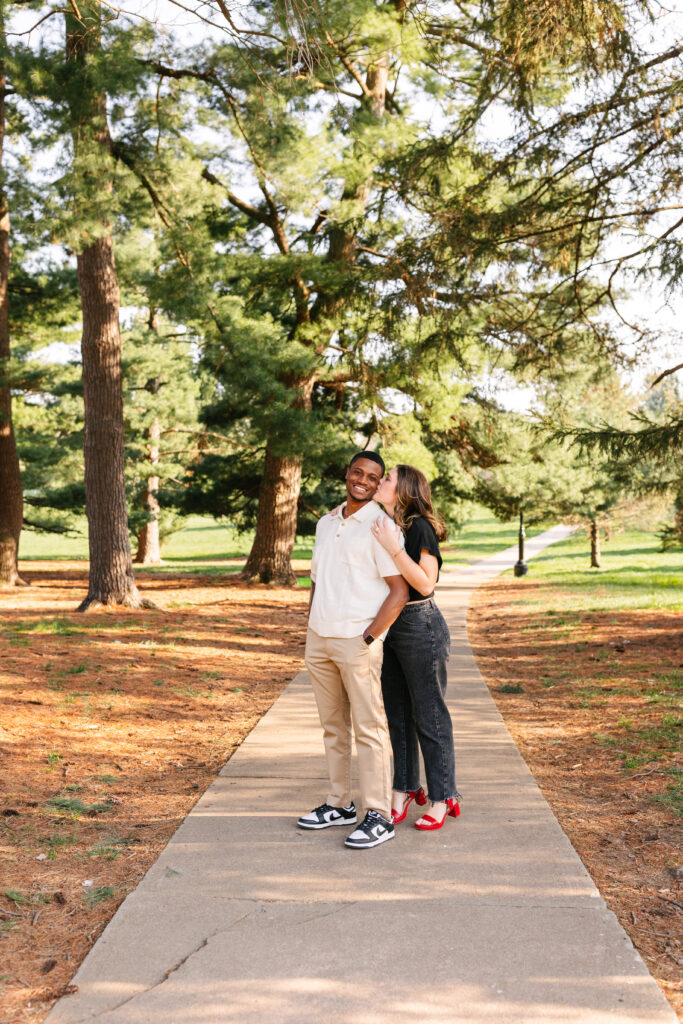 After the big moment, we wandered through Loose Park—soaked in sunlight, surrounded by cherry blossoms and fresh greenery. Molly and Jordan slipped so effortlessly into pure, happy love. They cuddled under the blooming branches, danced along the path, and shared sweet glances that made the entire session feel like something straight out of a movie.