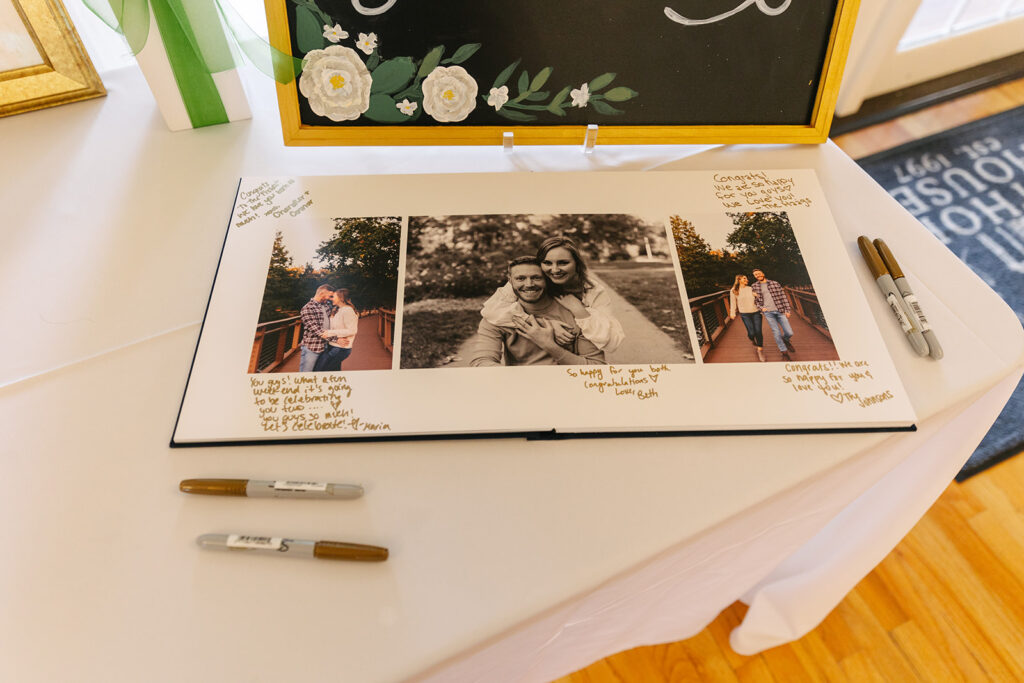 Many couples create a guest book using their engagement photographs. It’s a beautiful way to display your images while letting guests write in the margins. The pages become filled with love and memories — and the book becomes something you’ll actually keep on your coffee table.
