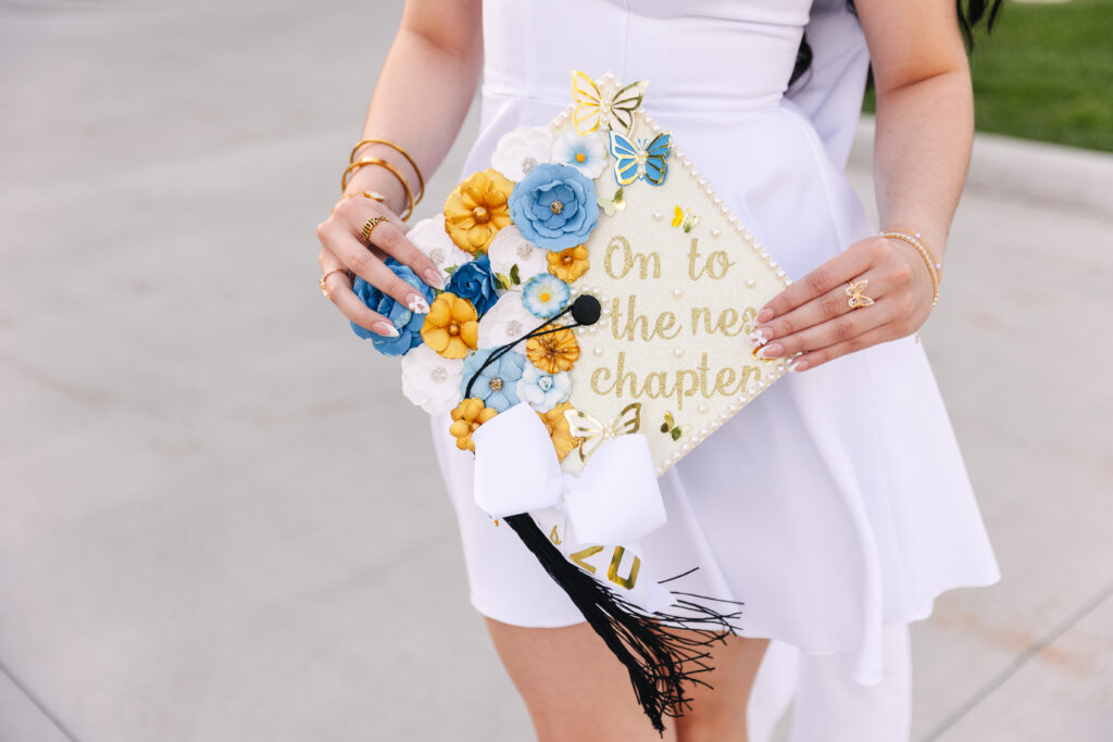 Her white dress flowed perfectly in the breeze, and the details she chose for her session made it even more special. Her graduation cap, decorated with blue and gold flowers and the words “On to the next chapter,” was a perfect reflection of her bright, optimistic spirit.