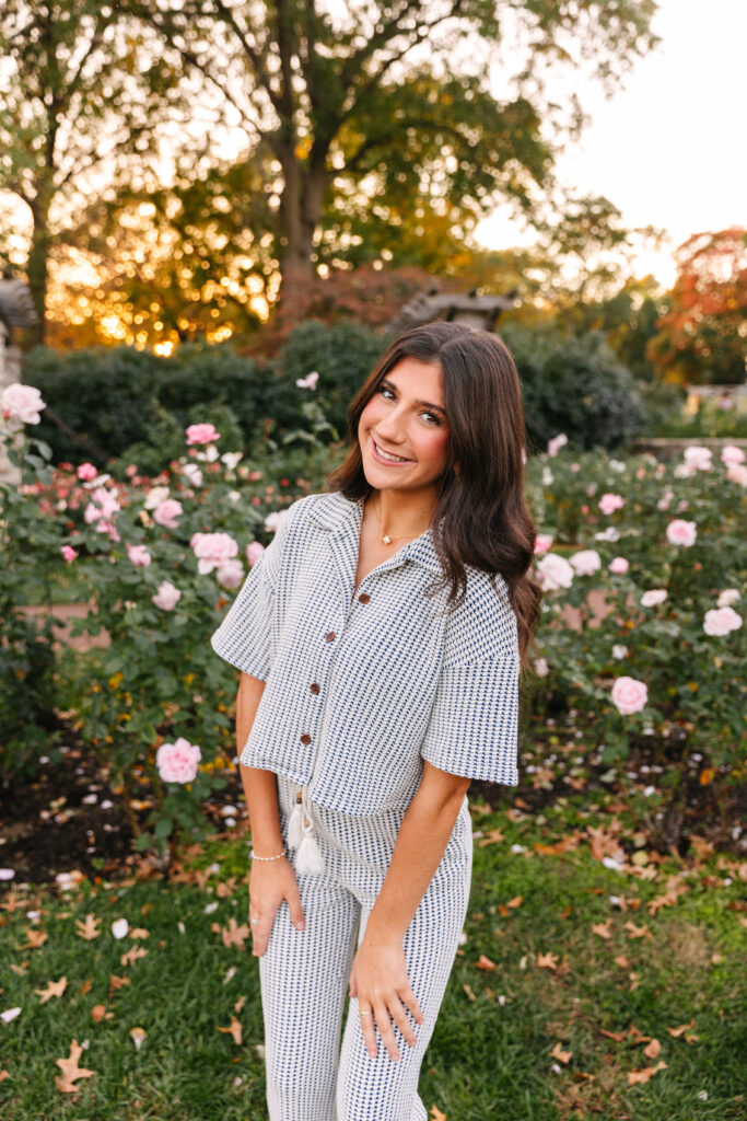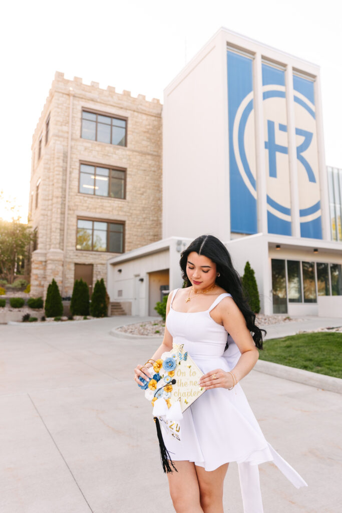 Throughout her session, Katherine was radiant. Every pose felt effortless—her joy and pride shone through in every photograph. We explored some of Rockhurst’s most iconic spots. Including the building with the bold blue “R” that makes the perfect backdrop for graduates!