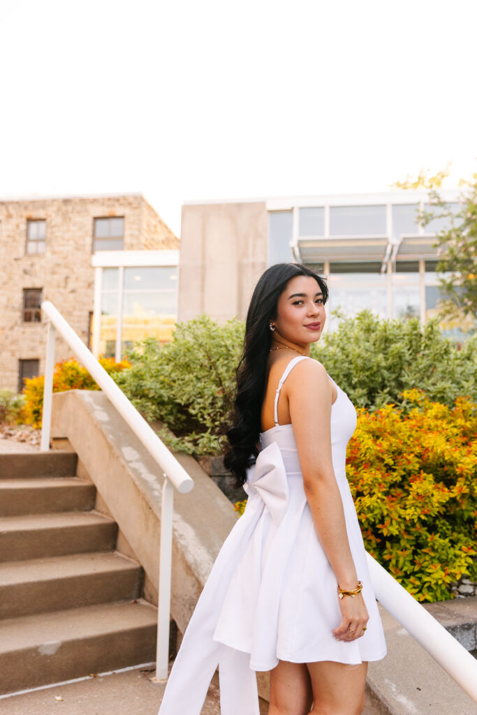 Raegan absolutely stunned in her senior session outfit! She wore a cream-colored mini dress with dainty flower apliques, giving her look a soft, feminine touch. Her gold heels with bows on the toes were the perfect finishing detail—classy, fun, and completely her style.
