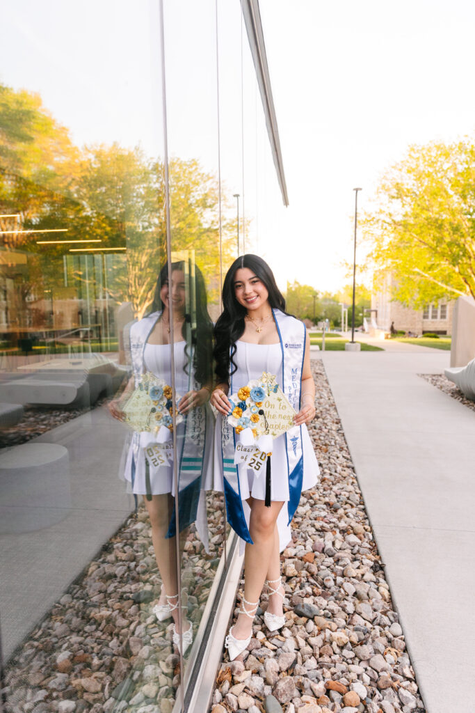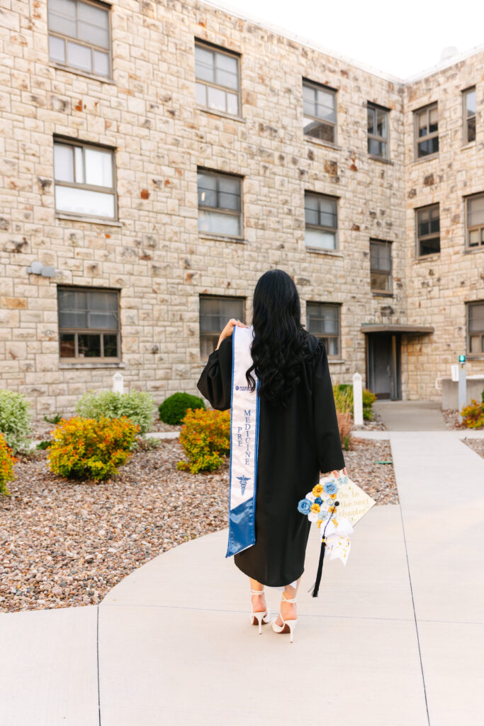 We met at Rockhurst University in Kansas City, and the campus could not have been more beautiful. The golden light streamed through the trees that afternoon. Which highlighted the mix of stone architecture and modern design that makes Rockhurst such a gorgeous session location. Katherine brought her cap, gown, and the biggest smile—it was clear she was ready to celebrate every bit of her hard work.