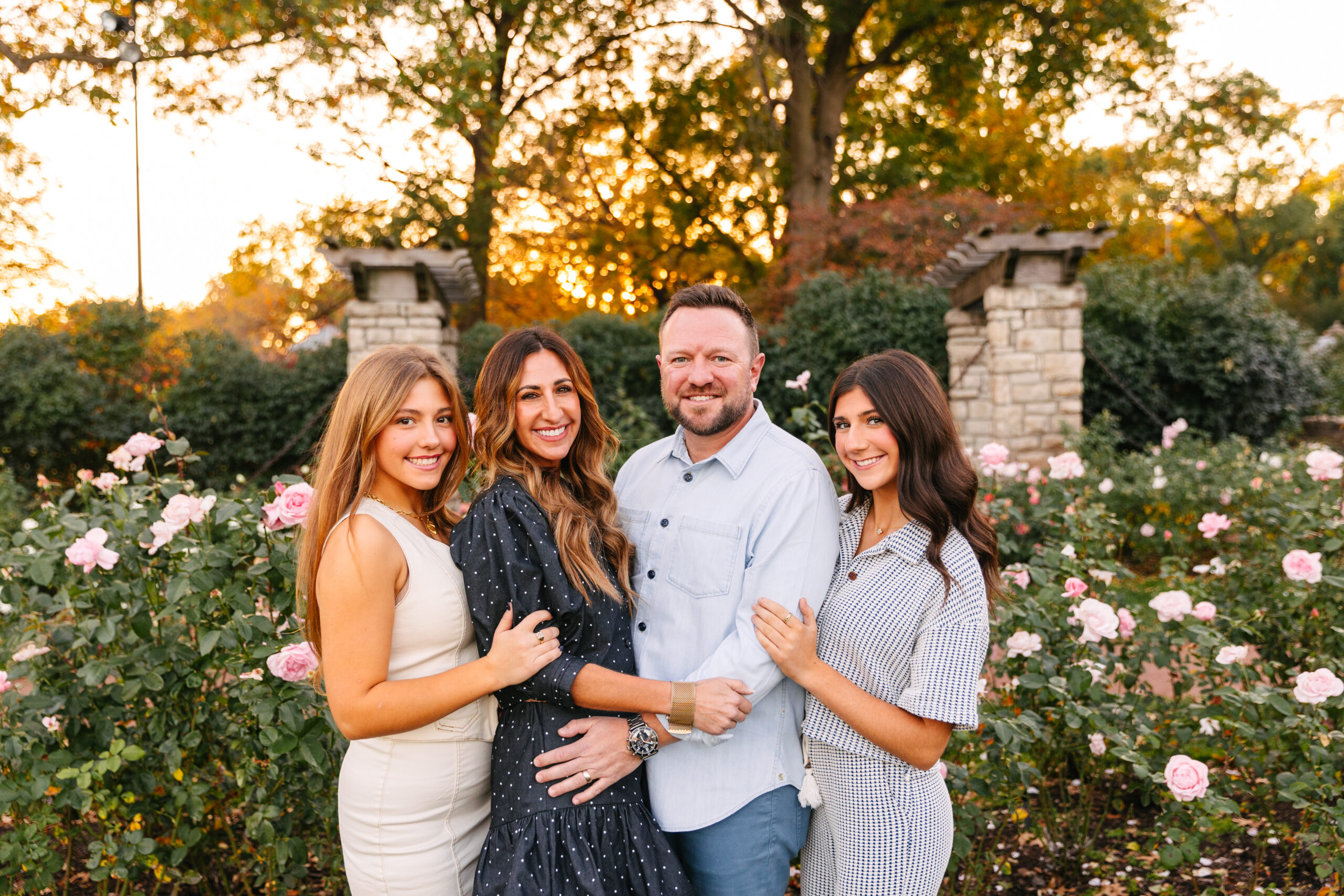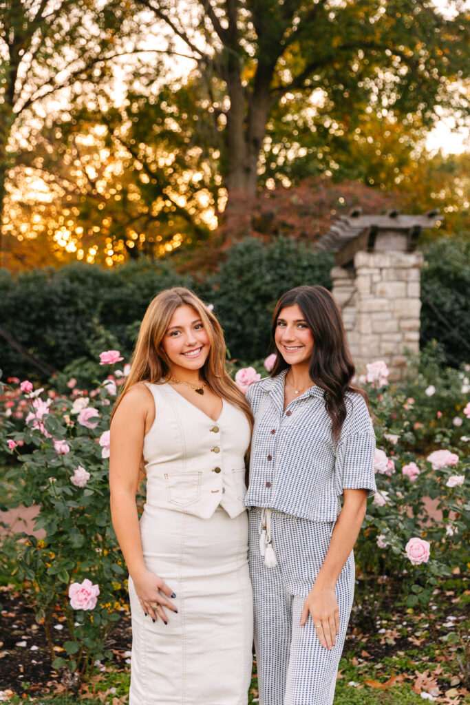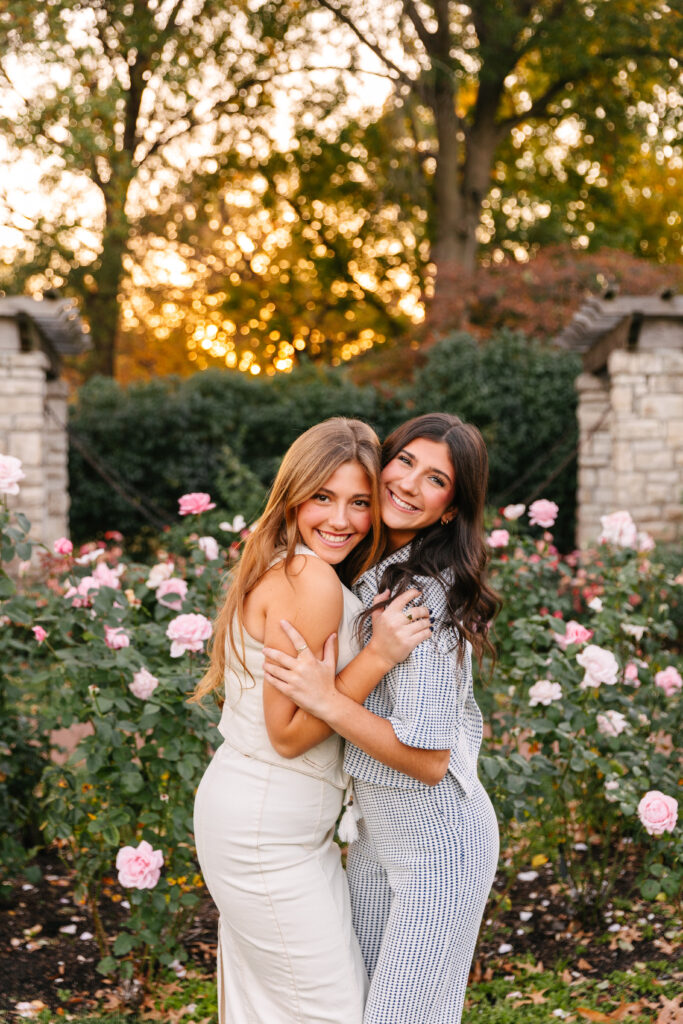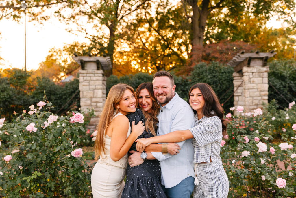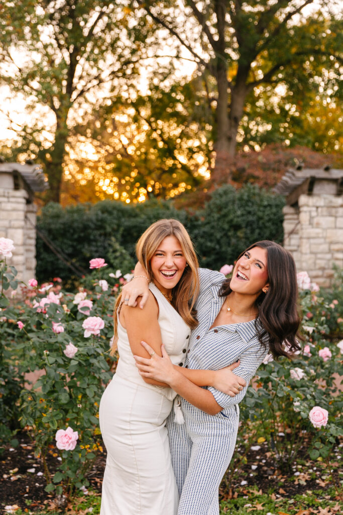 We wandered through the rose garden, walked beneath the stone arches, and laughed our way down the tree-lined paths. The golden light during sunset wrapped everything in a soft glow, creating that dreamy fall atmosphere Kansas City photographers love.