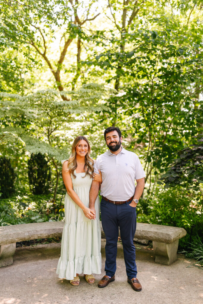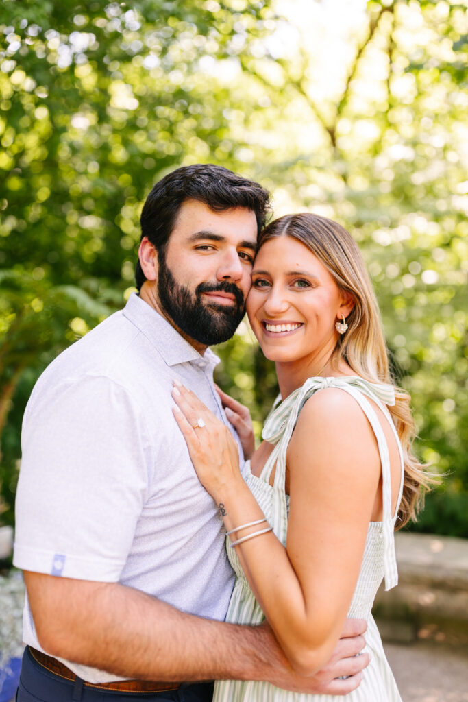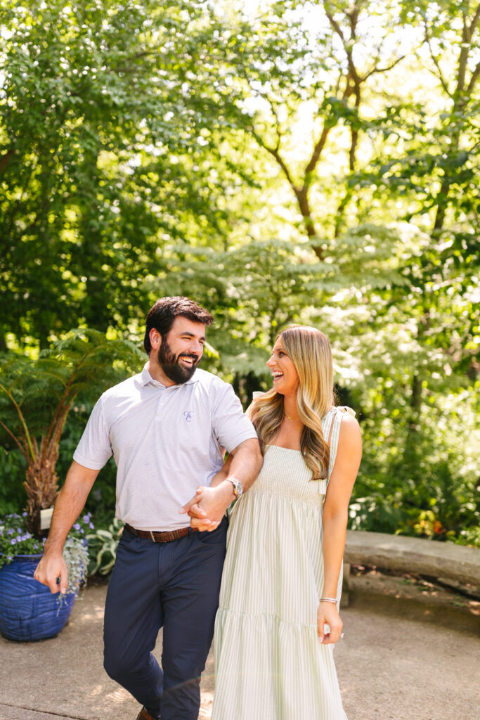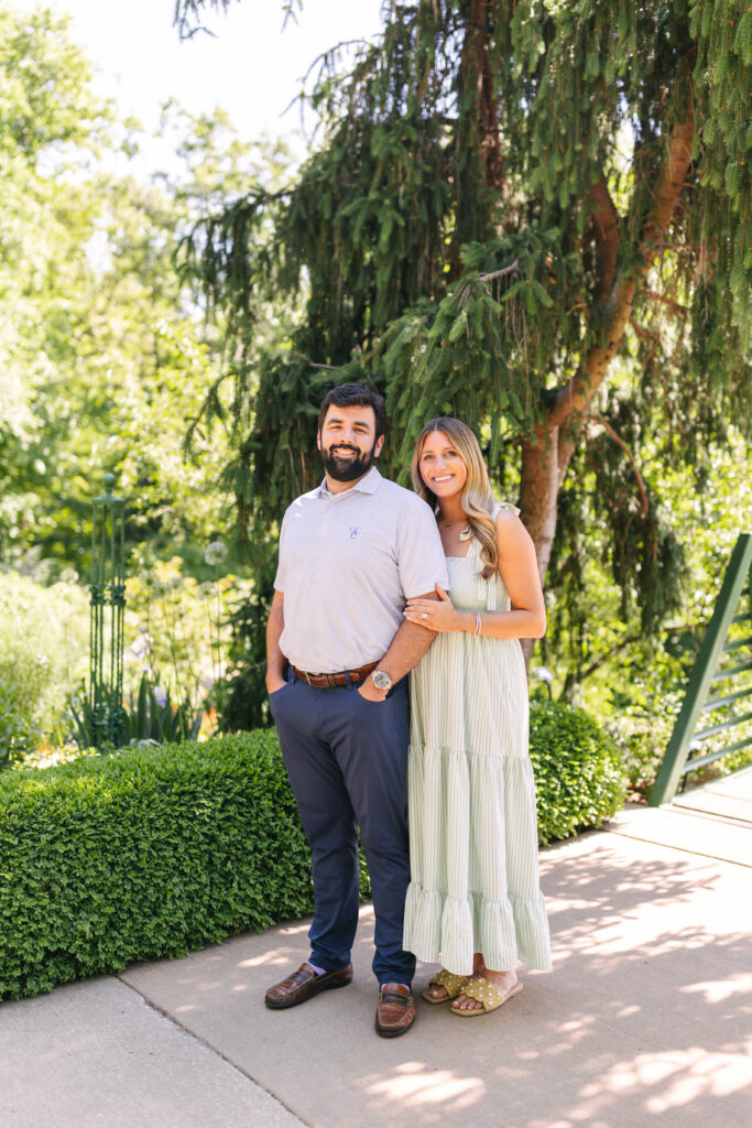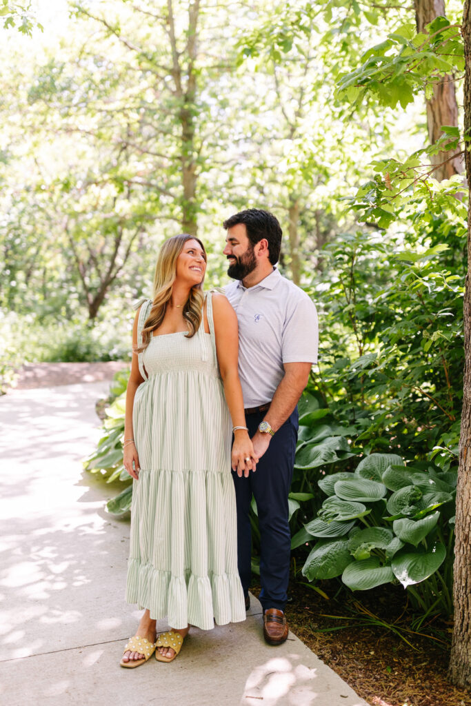 After the proposal, we wandered through the blooming garden and quiet pathways. Because the Arboretum offers layered backdrops, from floral beds to wooded trails, we captured a variety of portraits without ever leaving the property. The soft sage dress Haley wore paired beautifully against the vibrant pink florals. As a result, every image feels cohesive and timeless.